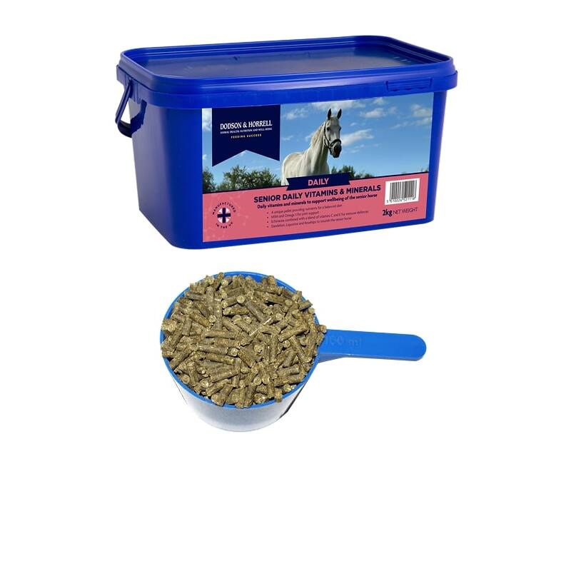 Senior Daily Vitamins and Minerals The low intake supplement to support veteran horses Information Formulated without cereals, molasses, alfalfa and soya.