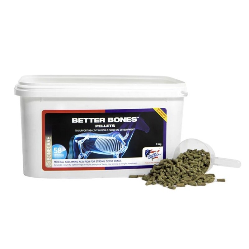 Equine America Better Bone. Better Bones Pellets are a carefully researched combination of key minerals, vitamin D3, vitamin K, collagen and amino acids, to support correct bone growth and development in young, growing horses, including young racehorses and performance horses entering training, as well as broodmares. The skeletal development and health of a young horse begins in utero, and ensuring the broodmare receives the correct intake of key nutrients will be critical to the growth of the unborn foal. Producing high-quality milk places a significant drain on the nutrient reserves of the mare, and maintaining mineral intakes during peak lactation is vital to ensure the foal receives the best nutrition to support the rapid skeletal development in the early weeks and months of growth. Mineral and other nutrient imbalances in growing youngstock have been recognised for some time as a potential factor in the incidence and severity of developmental skeletal abnormalities, and although genetics and environmenta