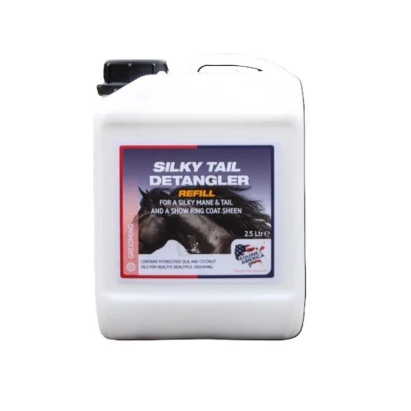 Equine America Squeaky Clean Silky Tail Detangler. Mane, tail and coat shine spray with a highly effective dust and dirt repellent action. The newly developed silicone oil microemulsion makes the hair soft and naturally shiny. The hair is tangle-free and easy to comb, it keeps its volume without feeling artificial. The powerful dust and dirt repellent action and tangle-free effect lasts for several days. Dermatologically tested and approved, for intensive but gentle care. Directions Spray onto the coat, or mane and tail. Let it dry briefly, then untangle the tail. Shake well before use! Contains silicone oil microemulsions.