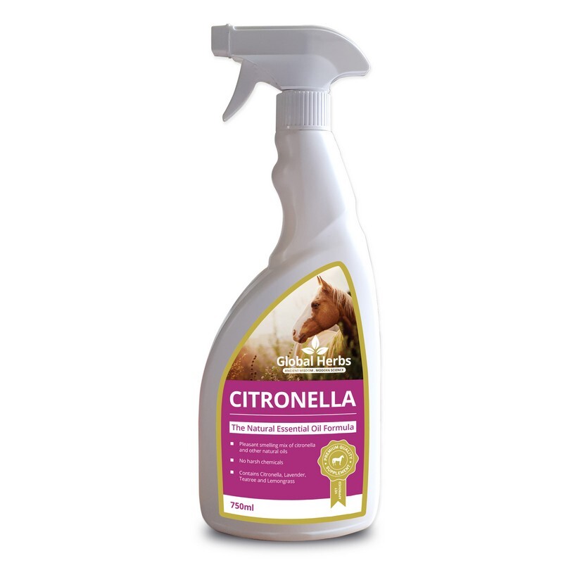 Global Herbs Citronella Spray. A complex formula with the traditional impact of essential oils and citrus that provide natural, reliable soothing from biting insects and other issues. This unique formula is packed with powerful essential oils including Lavender, Tea Tree and Lemon Grass. Keep your horse or pony smelling dreamy and fresh. IngredientsCitronella Oil, Lavender, Lemon Grass, Tea Tree. ApplyApply with an even spray, use a cloth for more sensitive face areas taking care around the eye area.