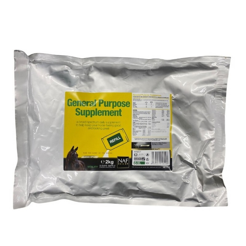 NAF General Purpose Supplement is a broad spectrum vitamin and mineral supplement formulated for the horse or pony in light-to-moderate work. Ingredients: Wheatfeed, Dicalcium phosphate, Maize, Brewers yeast, Whey protein powder, Sodium chloride, Whey powder, Magnesium oxide