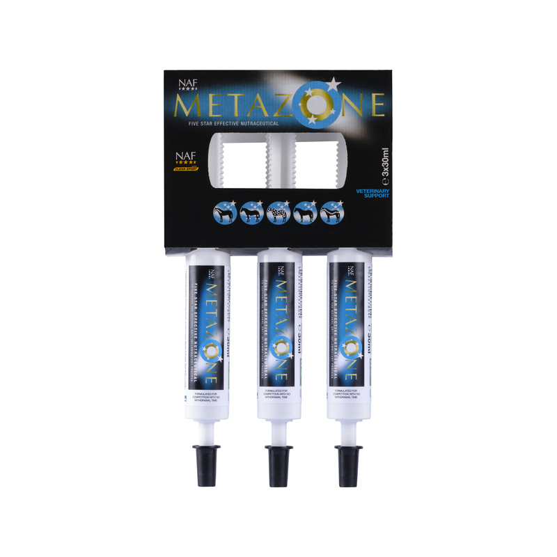 NAF Metazone Syringe. Formulated specifically to support the anti-inflammatory process, NAF Five Star Metazone is an effective Five Star nutraceutical for the management of horses who need something extra. Metazone is made up of a synergistic blend of ingredients that target the support of natural anti-inflammatory pathways. The plant based phytochemicals that make up this product support these pathways wherever they are needed in the body, whether that be for joints, feet, tendons, ligaments, muscles or skin. For those who compete, it is formulated to be competition safe with no withdrawal time, which means it can be fed every day or as needed to keep your horse in the zone . Composition Magnesium chloride, Rosehip shells, Omicha berries, Bark (Peony), Oregano herbal blend, Calcium carbonate, Monoglycerides of fatty acids (oleic acid). Analytical Constituents Crude protein <0.6% Crude fat <0.3% Crude ash 0.5% Crude fibre <0.1% Moisture 93.1% Sodium 0.04% Additives Flavours Milk thistle tinctu