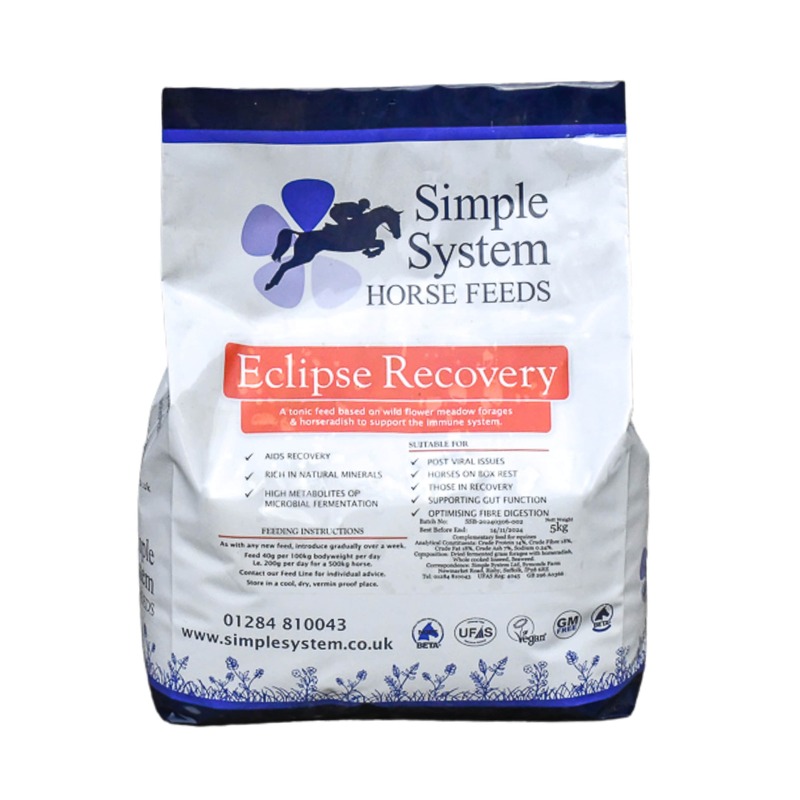 Simple System Eclipse Recovery is a tonic feed that is based on wild flower meadow grass forages and horseradish. These natural ingredients are great for aiding recovery, post viral issues, horses on box rest and to support overall gut function. Feed 40g per 100kg of bodyweight per day. As with all new feeds introduce gradually over one week. Nutritional Information Oil 16#18%, Ash 8-10%, Crude Protein 15-18%, Crude Fibre 16-22%, Sugar5% Starch5% Composition Dried fermented grass forages with horseradish, micronised linseed meal, seaweed meal.